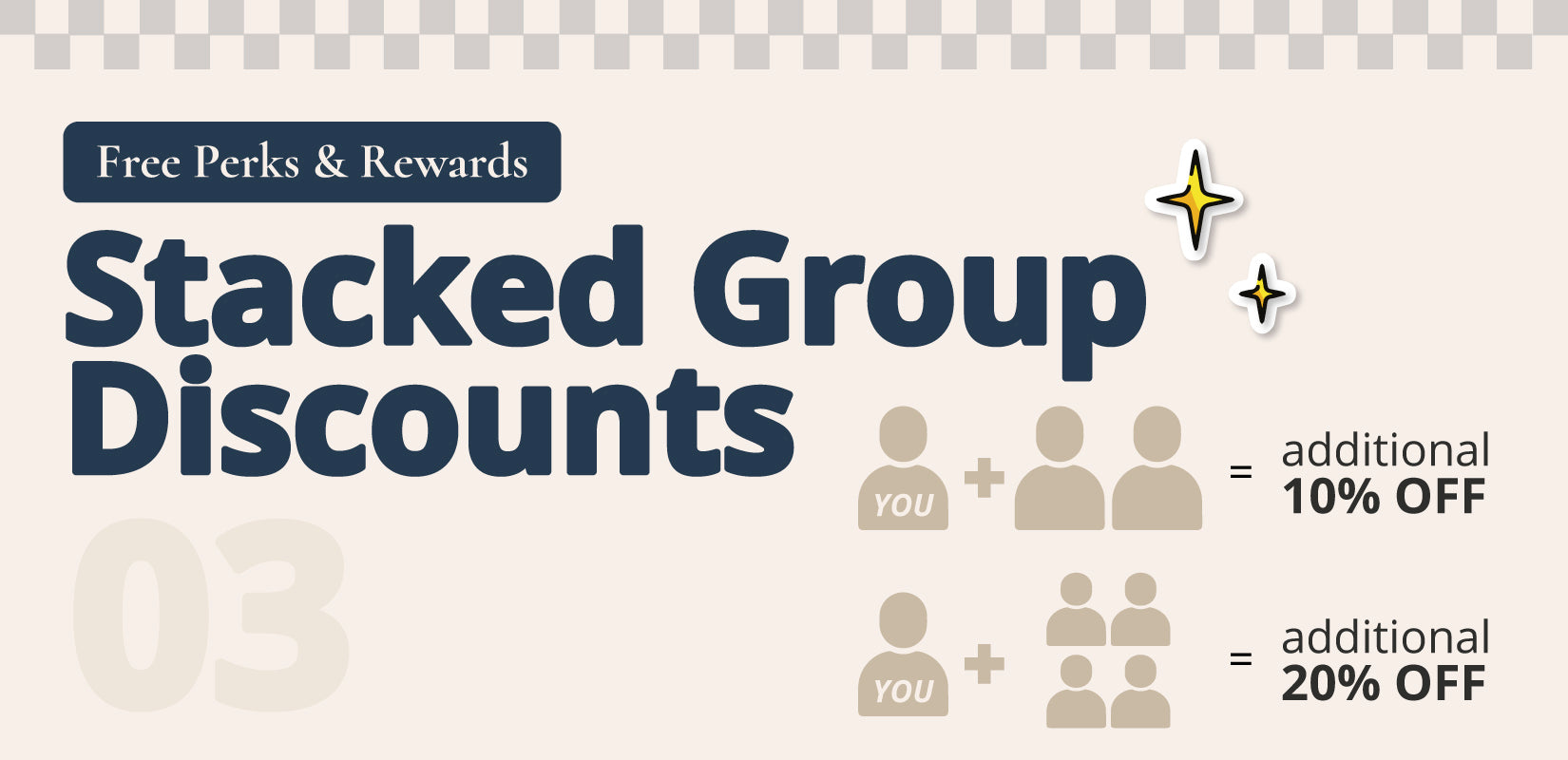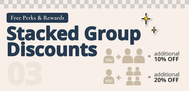 Enjoy an additional 10% off* for every 2 additional adult friends you bring. Your friends will enjoy the same discount as well!